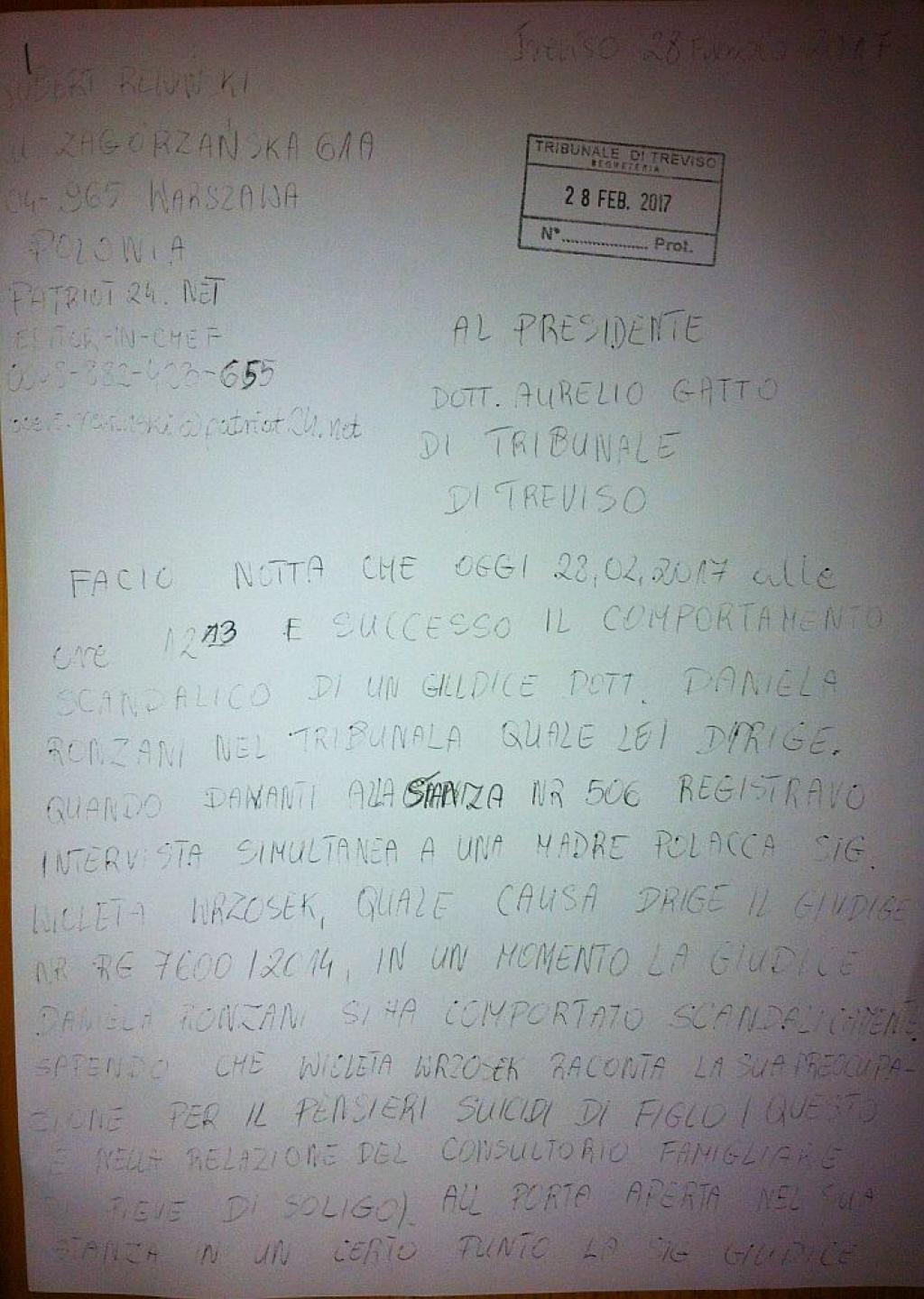 Redaktor Naczelny Patriot24.net natychmiast udał się do szefa Sądu w Treviso, Presidente Dott. Aurelio Gatto. Powstało ogromne zamieszanie jego w sekretariacie i okazało się, że Presidente nie przyjmie osobiście naszego Redaktora, w związku z zaistniałym skandalem. Sekretarka poprosiła, by opisać zdarzenie i przedłożyć w tej formie szefowi sądu.